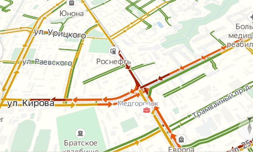 Вероятно, автомобили разворачивались. Во время маневра водитель грузовой машины не заметил легковушку и зацепил ее. Участники ДТП перекрыли автомобилями половину дороги. На улице Кирова в сторону центра, а также на улицах Шевченко и Крупской собираются пробки. Движение крайне затруднено.