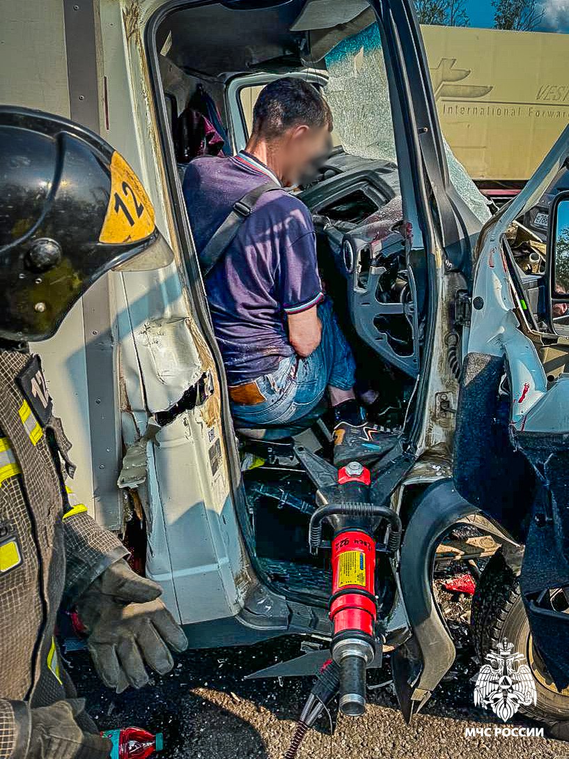 «Газель столкнулась с фурой, в результате чего в кабине оказались зажаты люди. Огнеборцы МЧС России вместе со спасателями Вяземского ГОЧС с помощью гидравлического инструмента деблокировали двух человек и передали прибывшим медикам», — отмечают представители регионального ГУ МЧС.