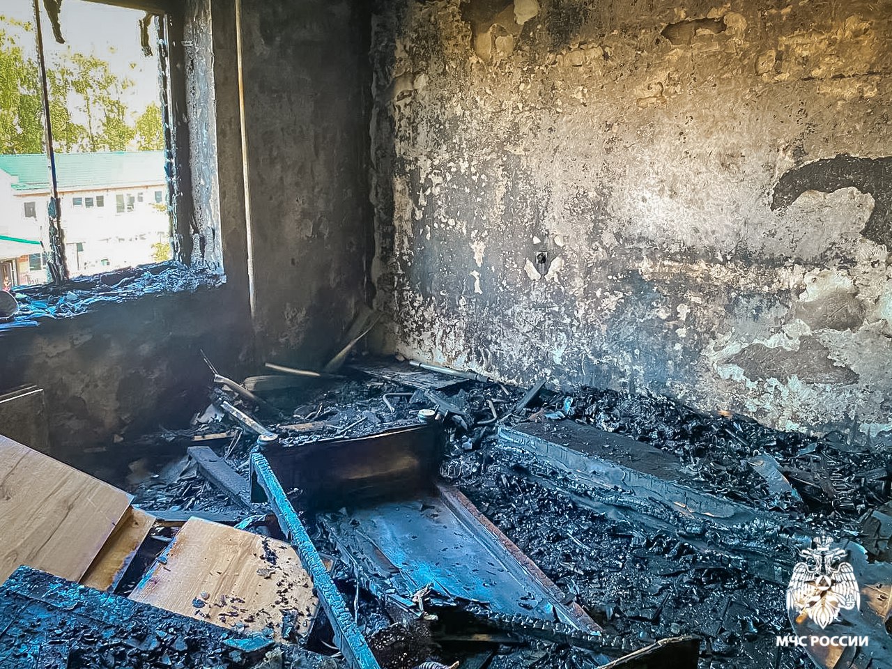 Спасатели прибыли на место уже через четыре минуты, в тот момент пламя вырывалось из окна. Пожарные ликвидировали пожар, не дав ему перейти на другие комнаты и в соседние квартиры.