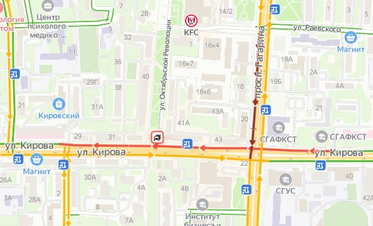 Движение в направлении улицы Нормандия-Неман практически остановилось. Кроме того, пробка затронула участок проспекта Гагарина возле здания Следственного комитета.