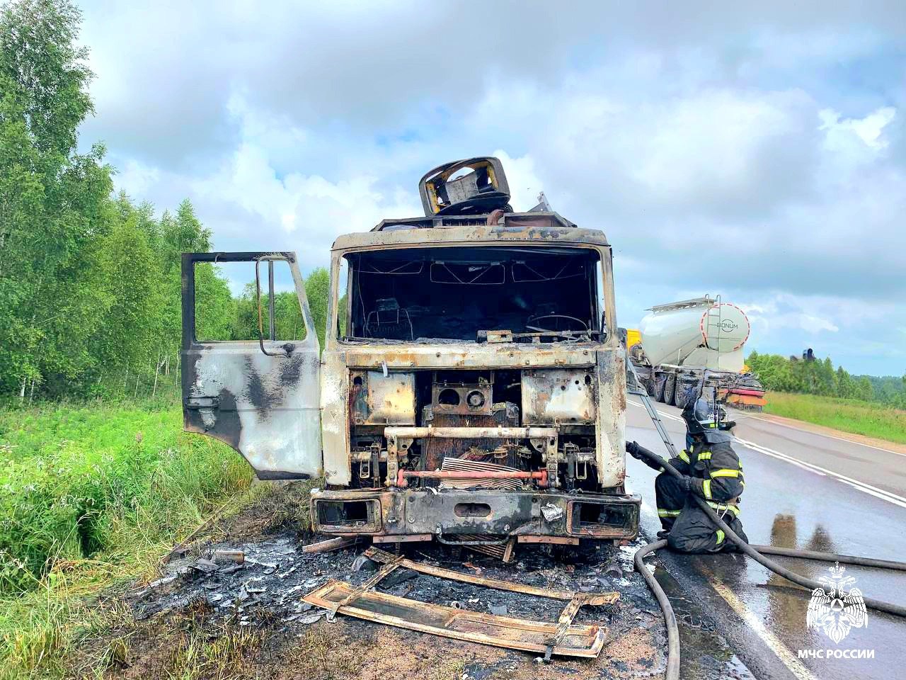 Как позднее рассказали водитель и его напарник, во время движения появилось пламя около правого колеса. Мужчины остановились и попытались сами победить огонь, однако он быстро распространился и перекинулся на кабину. Пришлось вызывать пожарных.