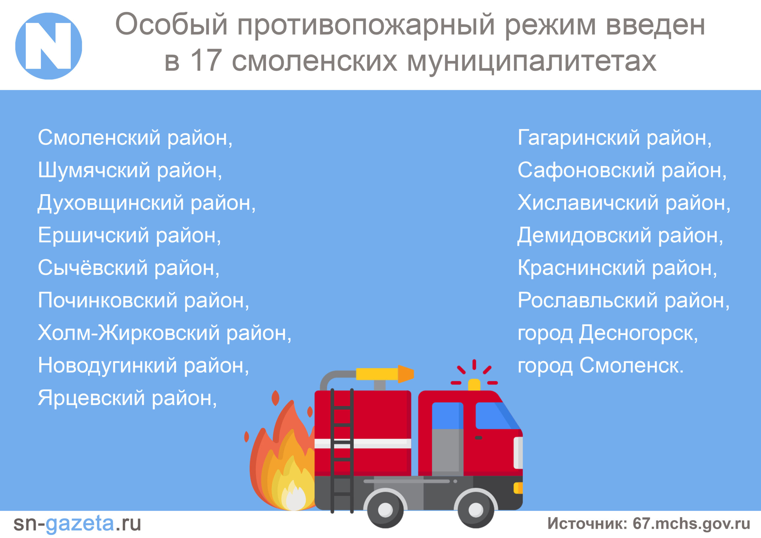 Напомним, в Смоленской области продолжает действовать особый противопожарный режим. Он введен администрациями уже 17 муниципальных образований. О том, что подразумевает этот статус, «Смоленская народная газета» писала ранее.