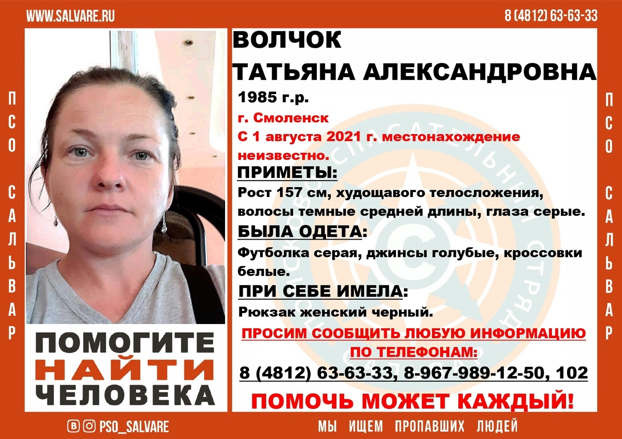Всех, кто узнает 36-летнюю Татьяну Волчок просят обратиться в ПСО «Сальвар» с информацией о ее местонахождении.