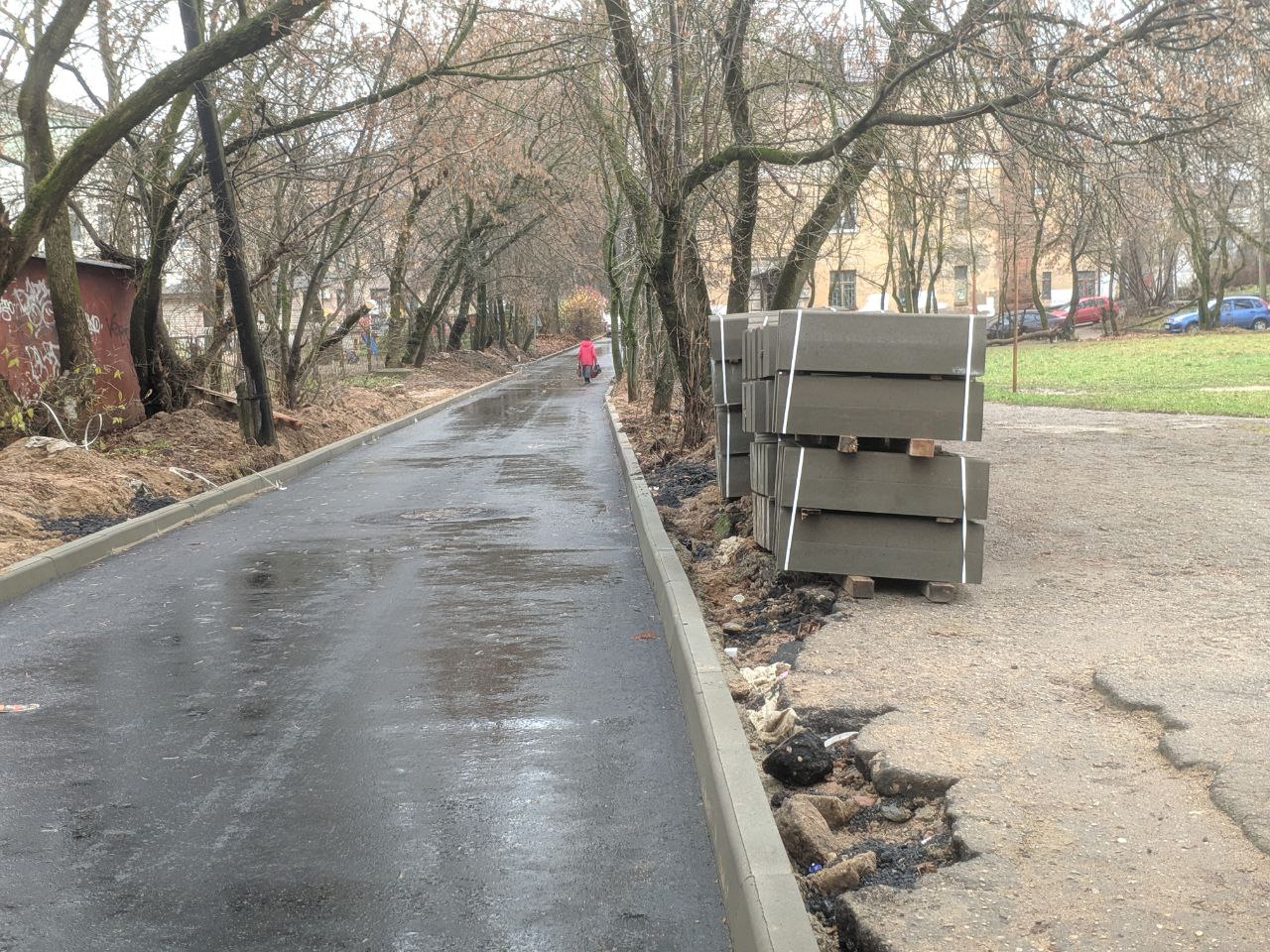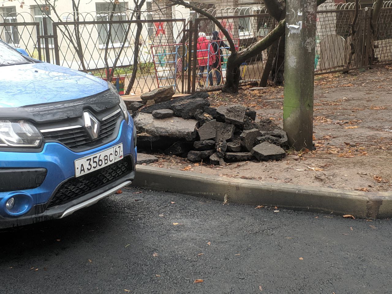 Другой сделанный проезд тянется от улицы Тенишевой до улицы Урицкого. Рабочие здесь разбросали мусор и не убрали после себя. Кроме того, они не стали увозить невостребованные бордюры, наверное, в надежде, что они сами рассосутся или местные жители их растащат.