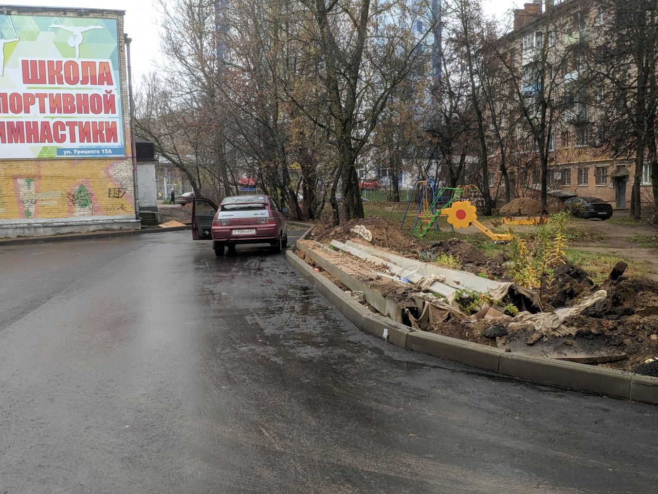 Единственное, площадку для машин не стали асфальтировать, как это было в случае с проездом на улице Черняховского: проектом не предусмотрено — зато жителям приятно. Но увы.