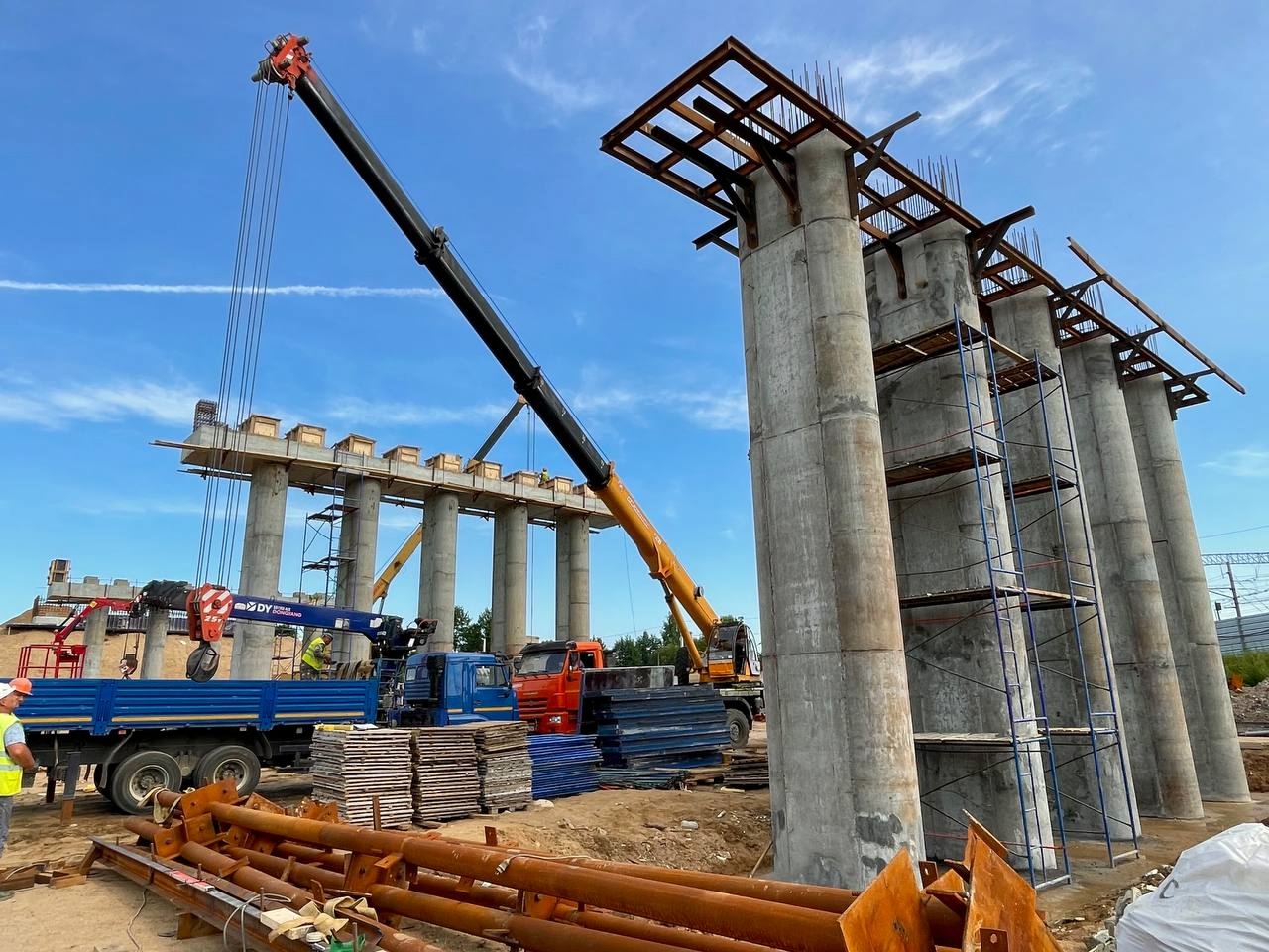 В настоящее время уже завершено строительство всех 8 бетонных опор будущего путепровода, продолжается сборка временных приемных опор.