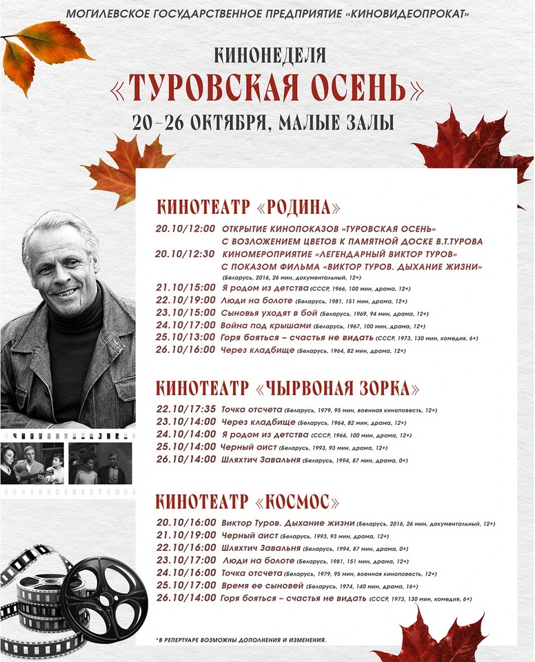 В белорусском Могилеве с 20 по 26 октября традиционно проходит кинонеделя «Туровская осень». Показ ретроспективы фильмов известного советского режиссера, народного артиста СССР и Беларуси Виктора Турова в его родном городе организуется ежегодно, начиная с 2001-го.