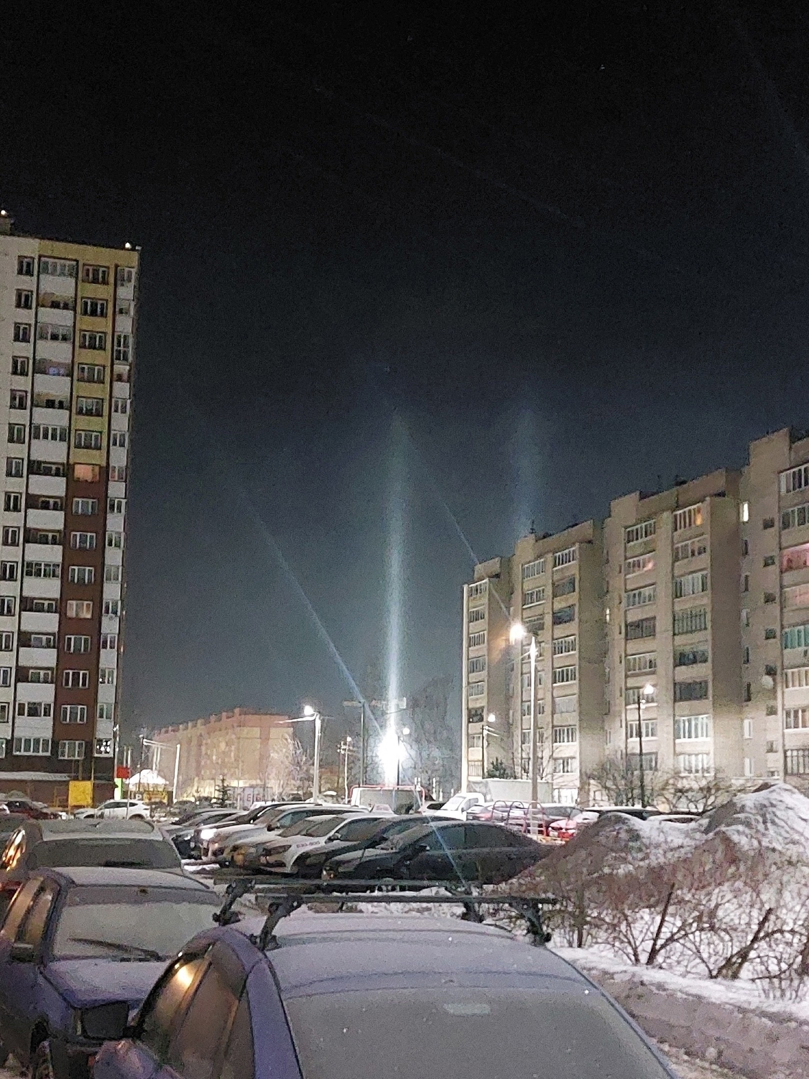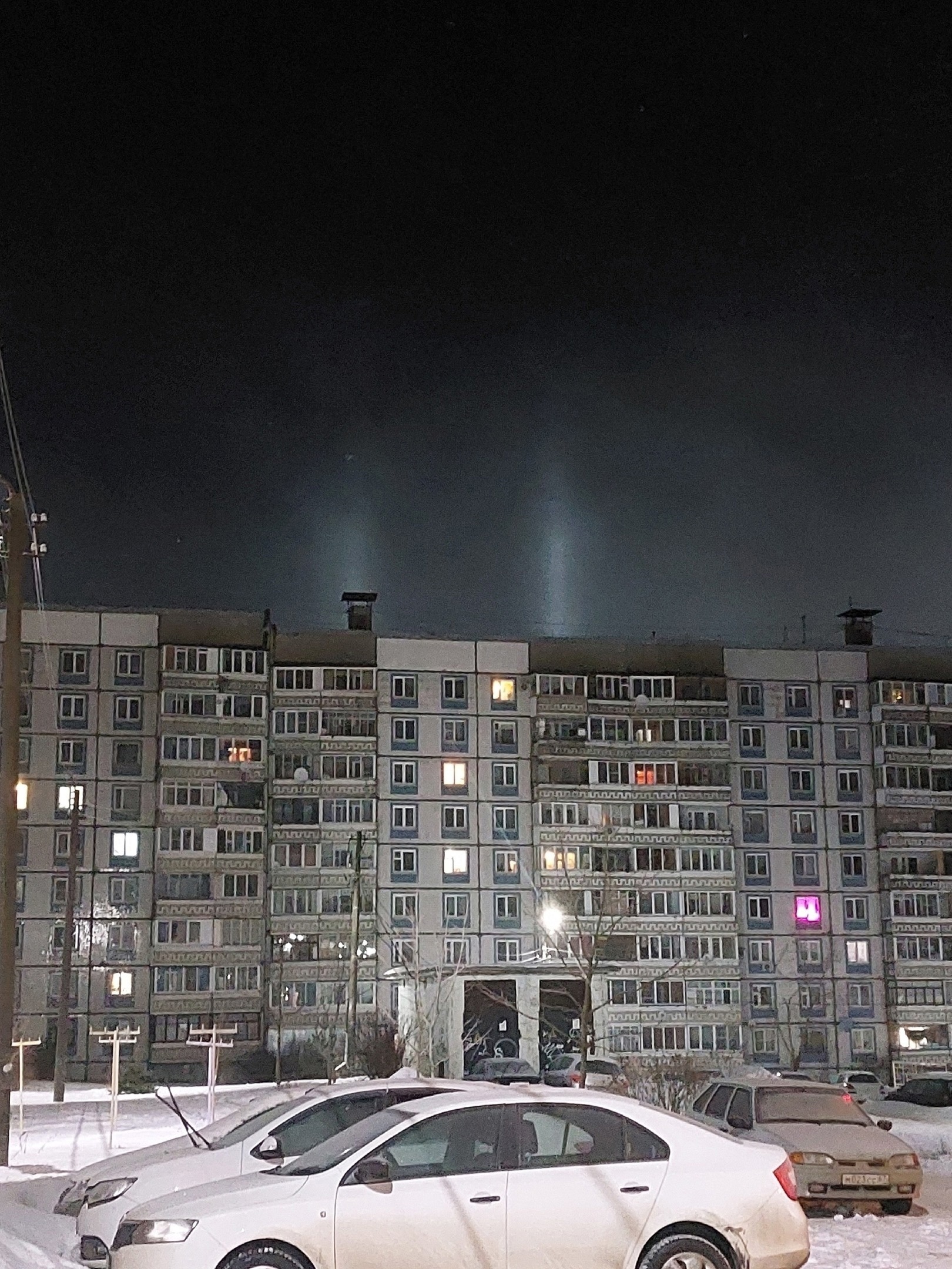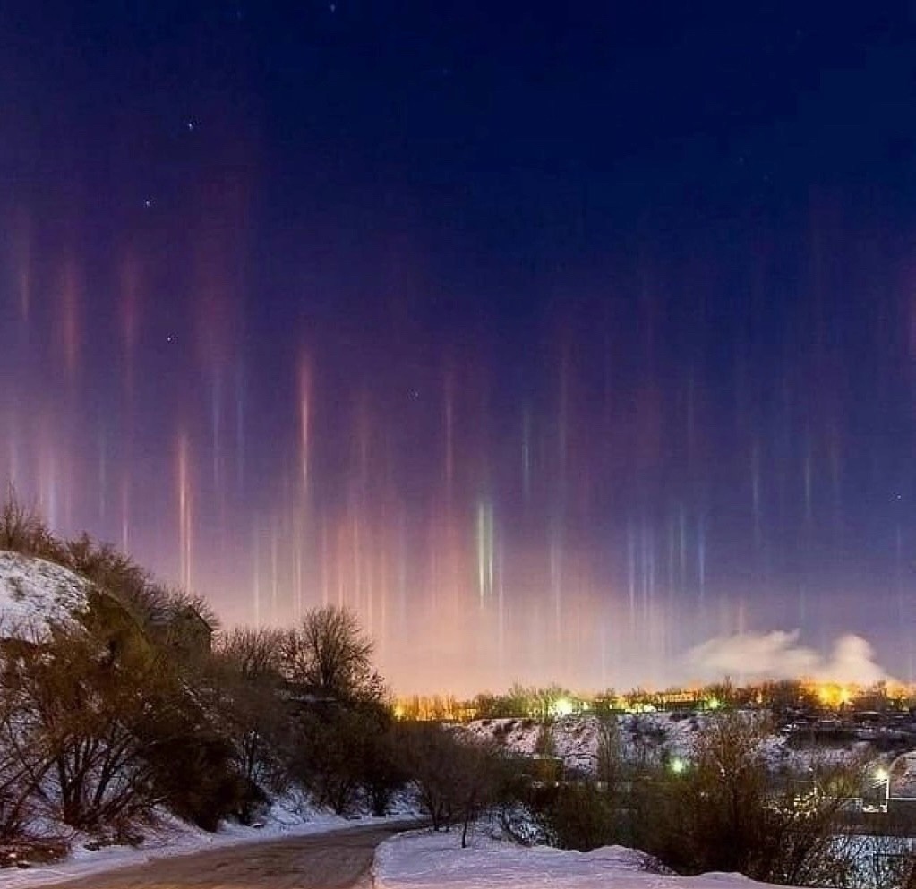 Впрочем, холод это не единственный фактор появление такой красоты в небесах. Необходимы также, чтобы в воздухе «висели» плоские ледяные кристаллики. Через них проходит свет — причем не от солнца, а от искусственных источников. Расцветка столбов как раз и зависит от окрашенности освещения.