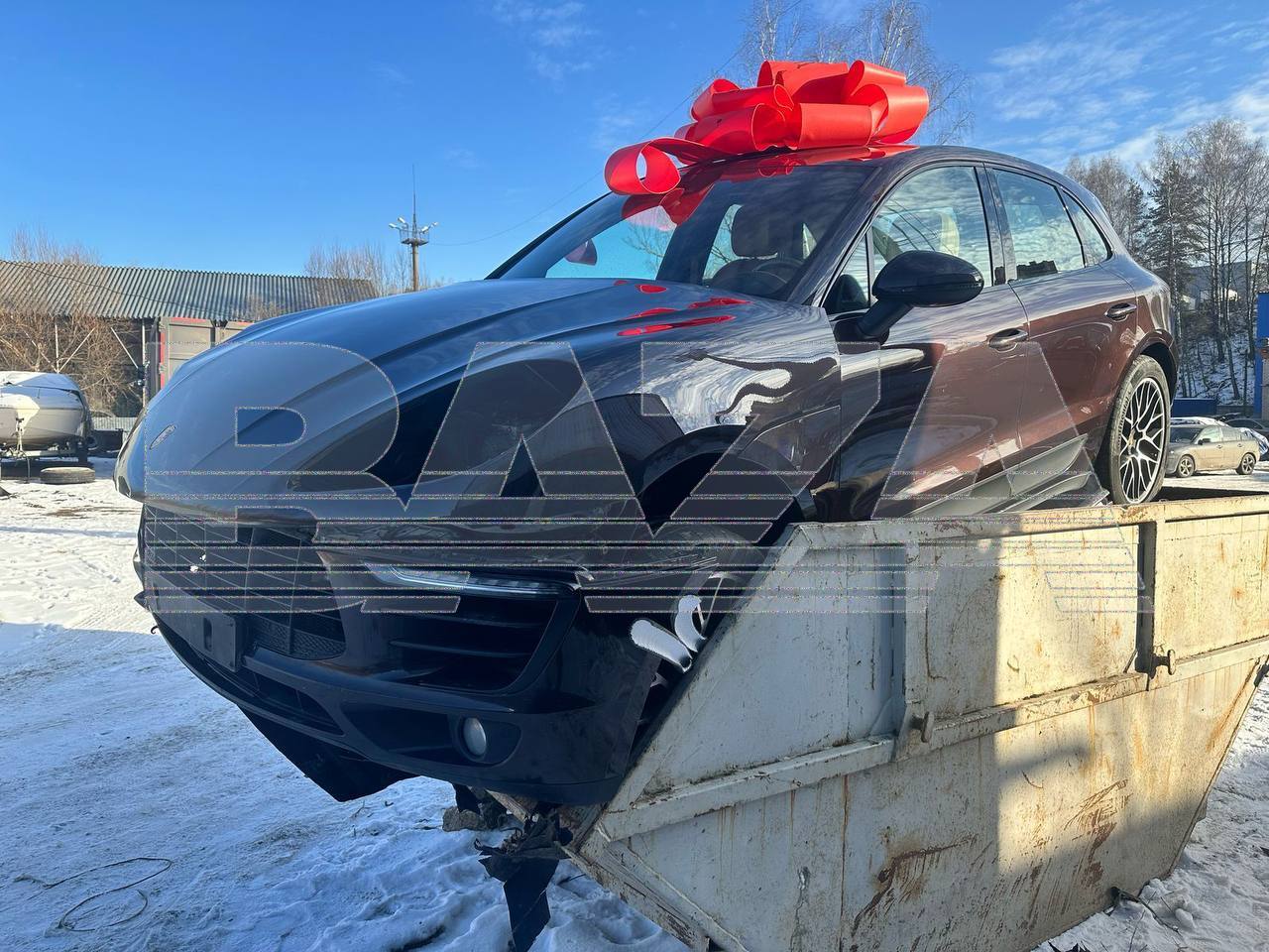 Супруга А., увидев битую иномарку, восприняла подарок как издевку и отказалась его принимать. Расстроенный муж, недолго думая, выбросил автомобиль в мусорный контейнер. С тех пор машина с красным бантом на крыше уже 12 дней «украшает» местную помойку, став настоящей достопримечательностью. Местные жители активно фотографируются с необычным экспонатом.