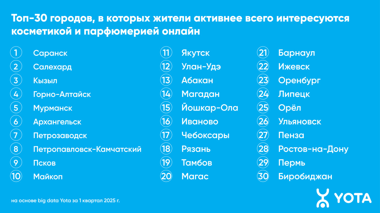 Жители Саранска, Салехарда и Кызыла чаще остальных интересуются онлайн-покупками косметики и парфюмерии. В топ-10 также вошли Горно-Алтайск, Мурманск, Архангельск, Петрозаводск, Петропавловск-Камчатский, Псков и Майкоп — на жителей этих городов, где мало или вовсе нет офлайн-точек крупных косметических сетей, приходится больше всего интернет-трафика в расчете на одного пользователя.
