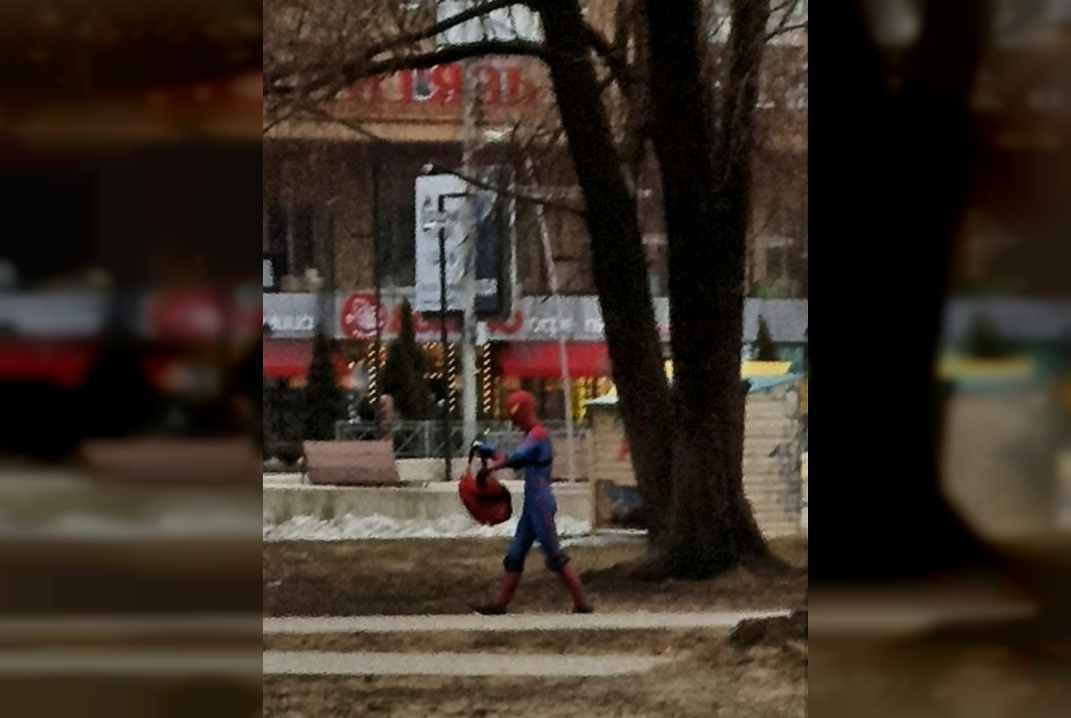 Жители Смоленска застали человека-паука на пешеходном переходе на Покровке. Вероятно, он спешил на помощь к попавшим в беду.