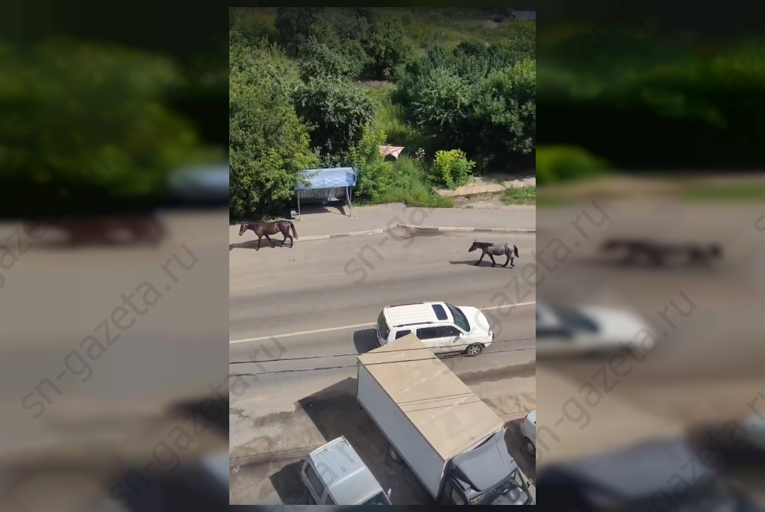 На кадрах заметно, что ушедшие из чьего-то хозяйства «две лошадиные силы» без страха и стеснения перемещаются по проезжей части, не опасаясь автомобилей.