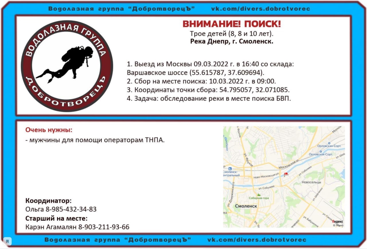 Отряд водолазов «Добротворецъ» объявил о приезде в Смоленск для поиска пропавших ранее мальчиков. Выезд из Москвы запланировали на 16:40 в среду, девятого марта. Прибытие и сбор на месте старта мероприятий — 10 марта, говорится в сообщении волонтеров в социальных сетях.