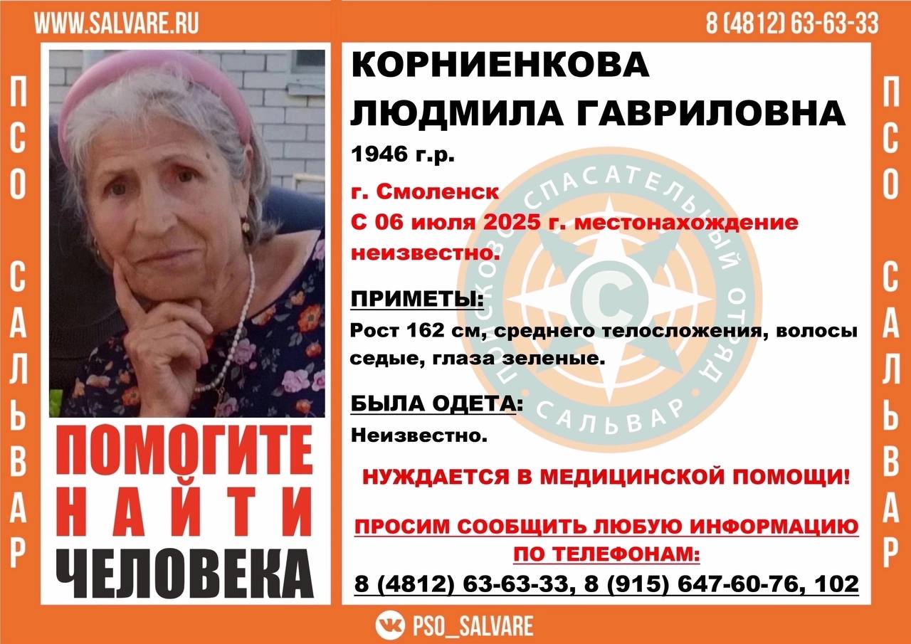В Смоленске пропала 79-летняя пенсионерка — Людмила Гавриловна Корниенкова. Где находится женщина, неизвестно, начиная с 6 июля.