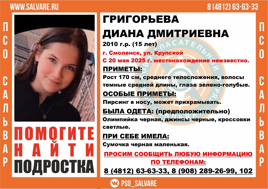 В четверг, 22 мая, в сети появилась информация, что в Смоленске пропала 15-летняя школьница Диана Григорьева. Поисково-спасательный отряд «Сальвар» объявил о поисках подростка.