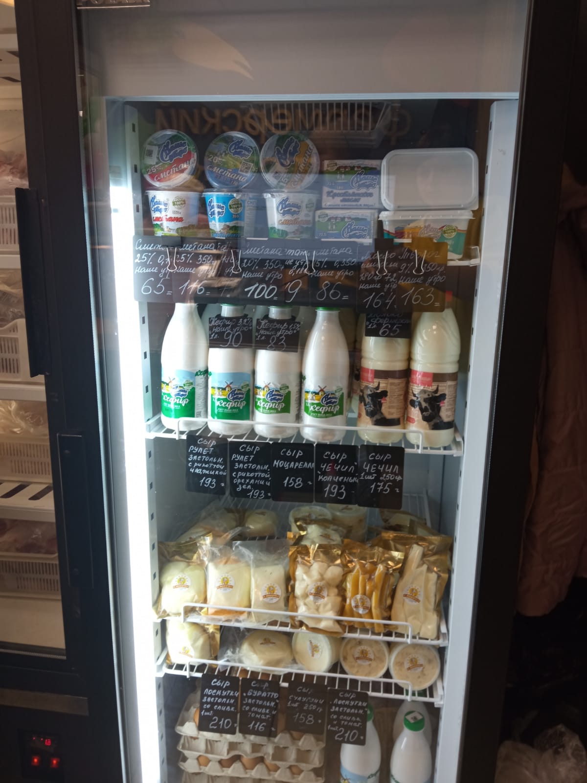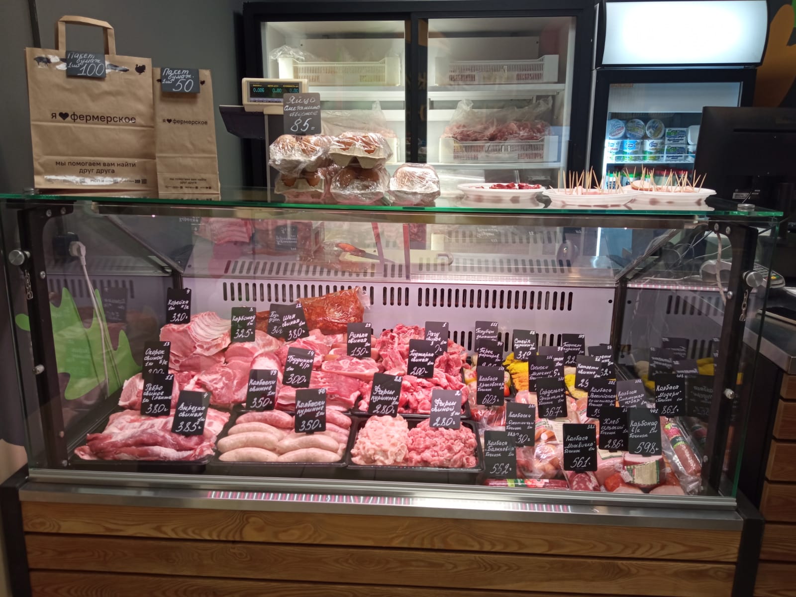 Покупателям предлагают мясные изделия, в том числе полуфабрикаты, молочную продукцию, хлеб, сыры. Как рассказывают производители, сюда будут поставлять молоко высокой жирности. Судя по фото прилавков, ценники здесь выше, чем в супермаркетах.