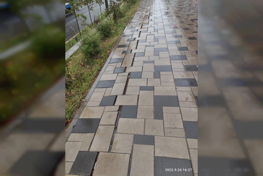 Клинкерная плитка постепенно уходит под землю, «сползая» в сторону проезжей части. «Разлом» идет вдоль тротуара и растягивается на несколько метров. Горожане отмечают, что трещина «растет» далеко не первый день. Недалеко от этого места остался разбитый асфальт, который не восстановили после ремонта.