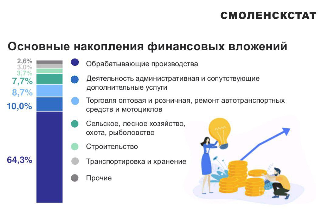 По итогам 2023 года смоленские организации накопили более 48 миллиардов рублей. Большая часть финансовых вложений принесло обрабатывающее производство, сообщает областная служба госстатистики.