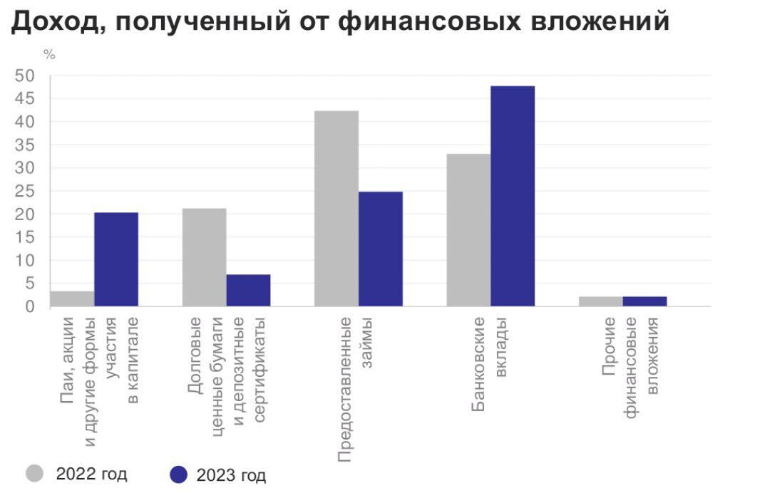 Большую часть дохода от имеющихся вложений что в 2022-м, что в 2023 году принесли банковские вклады и займы.