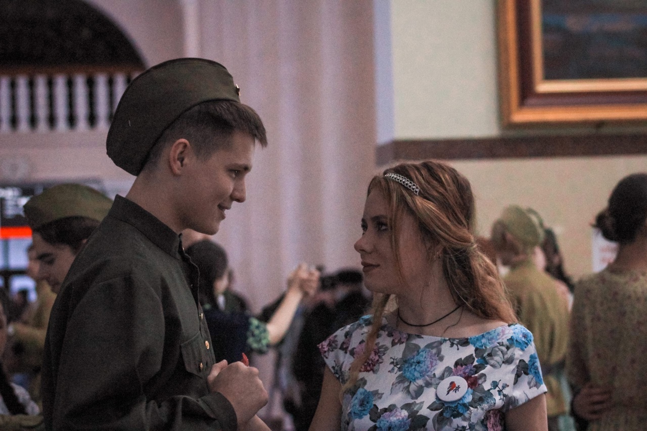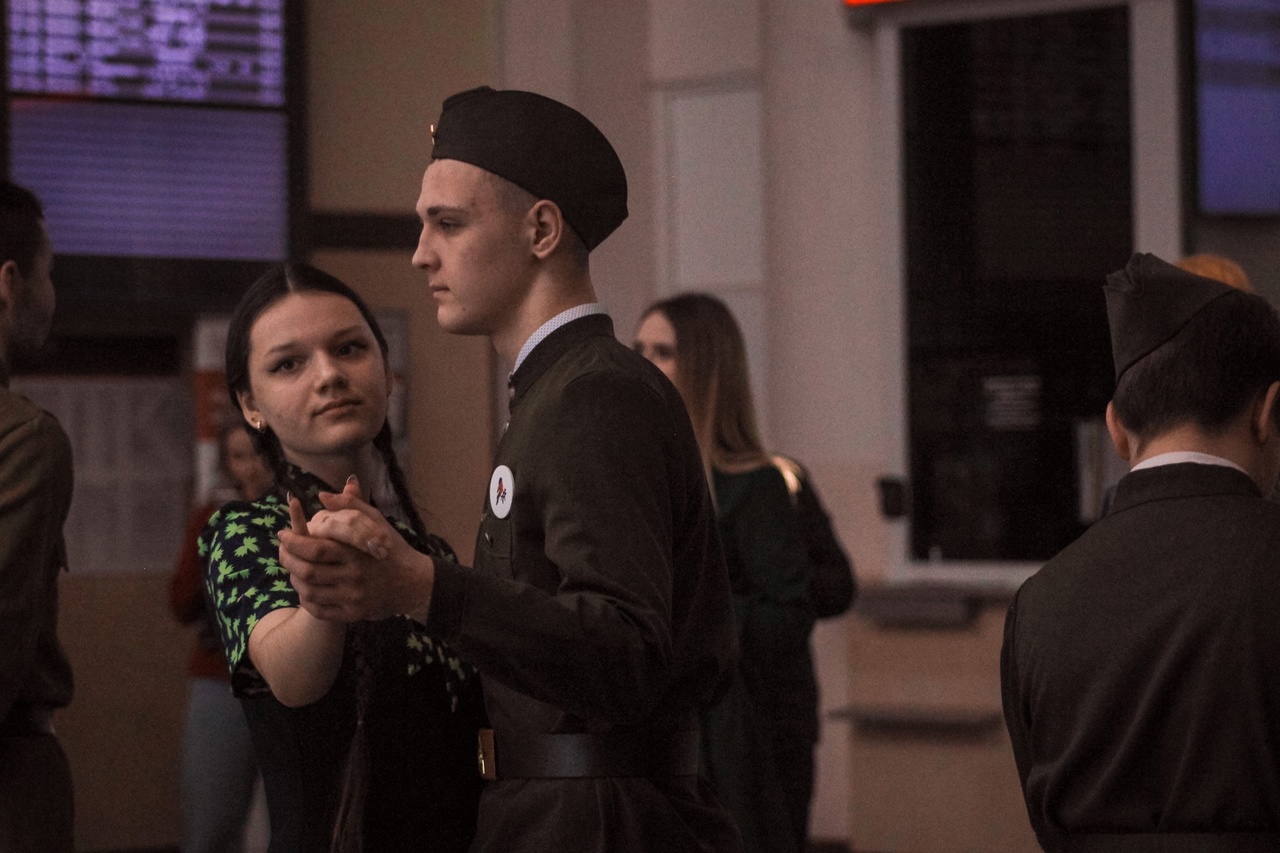 В флешмобе приняли участие студенты смоленских вузов. Он прошел в зале ожидания, в здании вокзала. Молодые люди переоделись в военную форму времен ВОВ, а девушки танцевали в вечерних платьях.