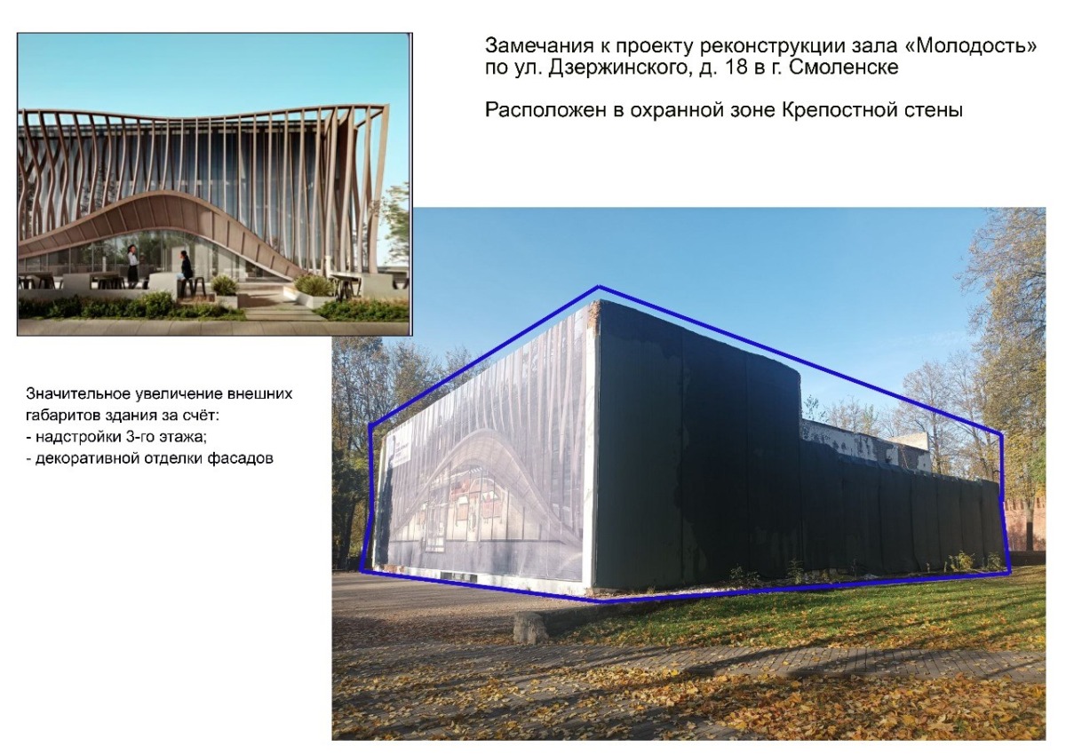 Жители Смоленска, прогуливающиеся по Лопатинскому саду, обратили внимание на то, как ведутся первые работы по реконструкции бывшего танцевального зала «Молодость». Негодование горожан вызвал тот факт, что проход, ведущий в центральный парк культуры и отдыха и расположенный слева от здания, существенно сузился.