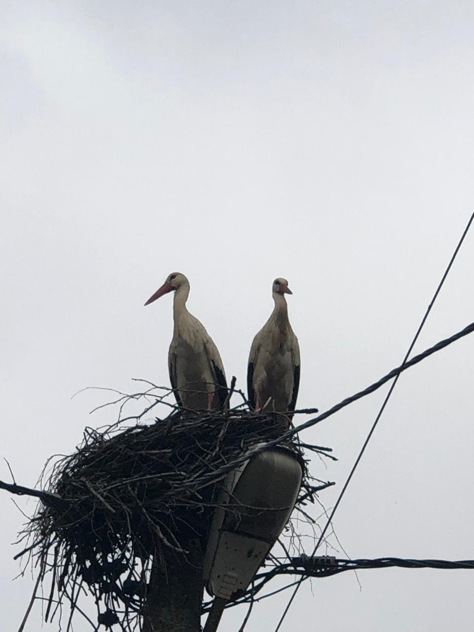 Уже три года белые аисты облюбовали территорию историко-архитектурного комплекса “Теремок” рядом с прудами: птицы с удовольствием там гнездятся. Пара свила себе большое гнездо на высоком столбе, где появлялись на свет птенцы, которые росли, крепли и знакомились с окружающим миром.