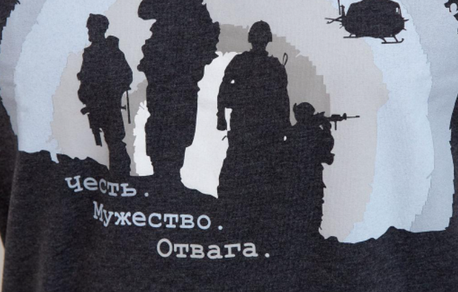 Подпись на футболке «Честь. Мужество. Отвага» не смогла сбить с толку бдительных пользователей соцсетей. «Шпионов» в патриотической коллекции выдала техника и оружие. В руках силуэты бойцов держат винтовку М-16, которая используется американскими вооруженными силами. Над головами солдат «летит» вертолет UH-1 «Ирокез».